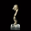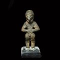Description: Detailed worked out bronze statuette of an undressed man who has his hands placed on the belly in a worshiping gesture. The man has a bird-like face with large bulging eyes, a long pointy nose and an angular chin beard. On top the face is framed by bangs, which end on the sides in circular punches, which can be interpreted as ears. The flat upper body is bent backwards, nipples and arms are accentuated. Striking are the strong upper thighs in relation to the narrow waist, in between the prominent phallus. The equally strong calves are pushed backwards, as if the adorant intends to fall on his knees any moment. The otherwise naked man wears clearly elaborate footwear on his feet, reaching up to his ankles. Votive figures such as the present one were found in northern Caucasus, e.g. in Karata in Dagestan. They possibly were made as presents to the gods close to sacrificial sites, sold and offered to the gods. Mounted.