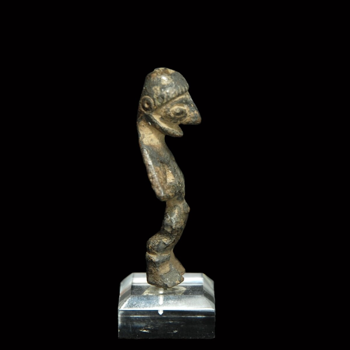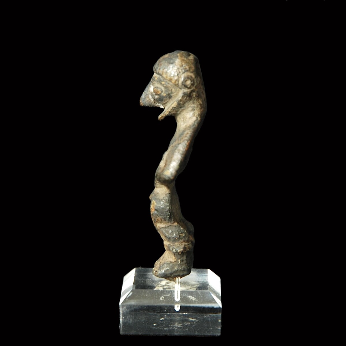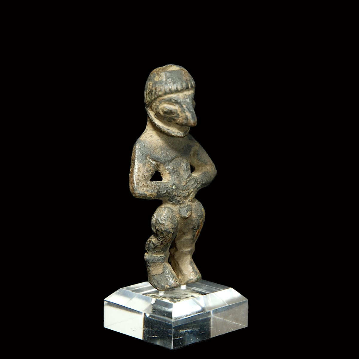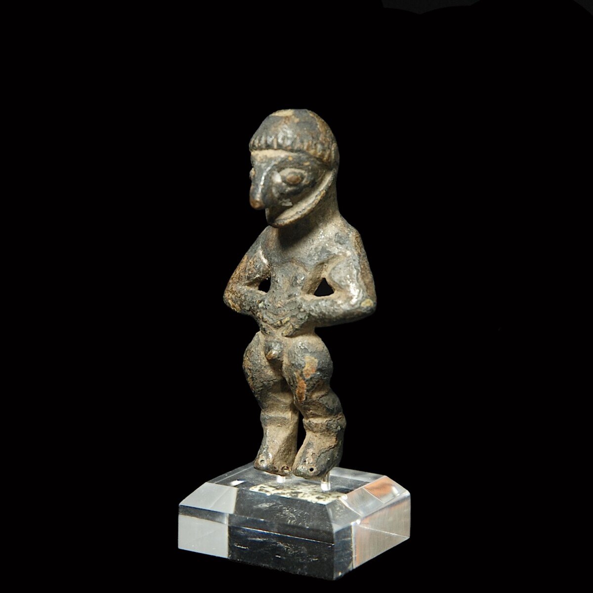 Description: Detailed worked out bronze statuette of an undressed man who has his hands placed on the belly in a worshiping gesture. The man has a bird-like face with large bulging eyes, a long pointy nose and an angular chin beard. On top the face is framed by bangs, which end on the sides in circular punches, which can be interpreted as ears. The flat upper body is bent backwards, nipples and arms are accentuated. Striking are the strong upper thighs in relation to the narrow waist, in between the prominent phallus. The equally strong calves are pushed backwards, as if the adorant intends to fall on his knees any moment. The otherwise naked man wears clearly elaborate footwear on his feet, reaching up to his ankles. Votive figures such as the present one were found in northern Caucasus, e.g. in Karata in Dagestan. They possibly were made as presents to the gods close to sacrificial sites, sold and offered to the gods. Mounted.