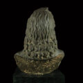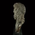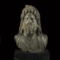 Description: Masterly worked out greywacke bust of Zeus Serapis based on the model that the Greek master Bryaxis created in the late 4th century B.C. for the Serapeum in Alexandria. The 12-meter-high original was destroyed in 391 A.D. by the Christians, preserved were high-quality copies dating to the Roman period, which were made of marble or alabaster throughout . Even more rare and more important is the present greywacke bust, which dates to the 1st century A.D. The head with a slender, angular face, which is framed by thick curls hanging into the forehead and over the temples. Below the nose a massive whisker, which merges into the curly beard. Well-known is the gaze from deeply sat eyes with finely drawn lids, which radiate gentleness and kindness and doubtlessly was copied by the Christians for the depiction of Jesus. Also, the slightly open mouth with the minimally hanging lower lip and the open space below has been established as symbol of gentleness in art history. The long hair cascades on the sides, covers the ears and falls far into the nape in the back. The kalathos, the harvest basket of Serapis, sits on the calotte, where today only parts are preserved. The bust itself is worked out in the Greek “curtain style”. It depicts a tunic and a himation thrown over it with a centrally protruding fold. The high quality of the greywacke underlines the importance of the syncretic God Serapis, who was introduced as an integrative Egyptian Greek empire god by Ptolemaios I and worshiped until far into the Roman period. On a stone base.