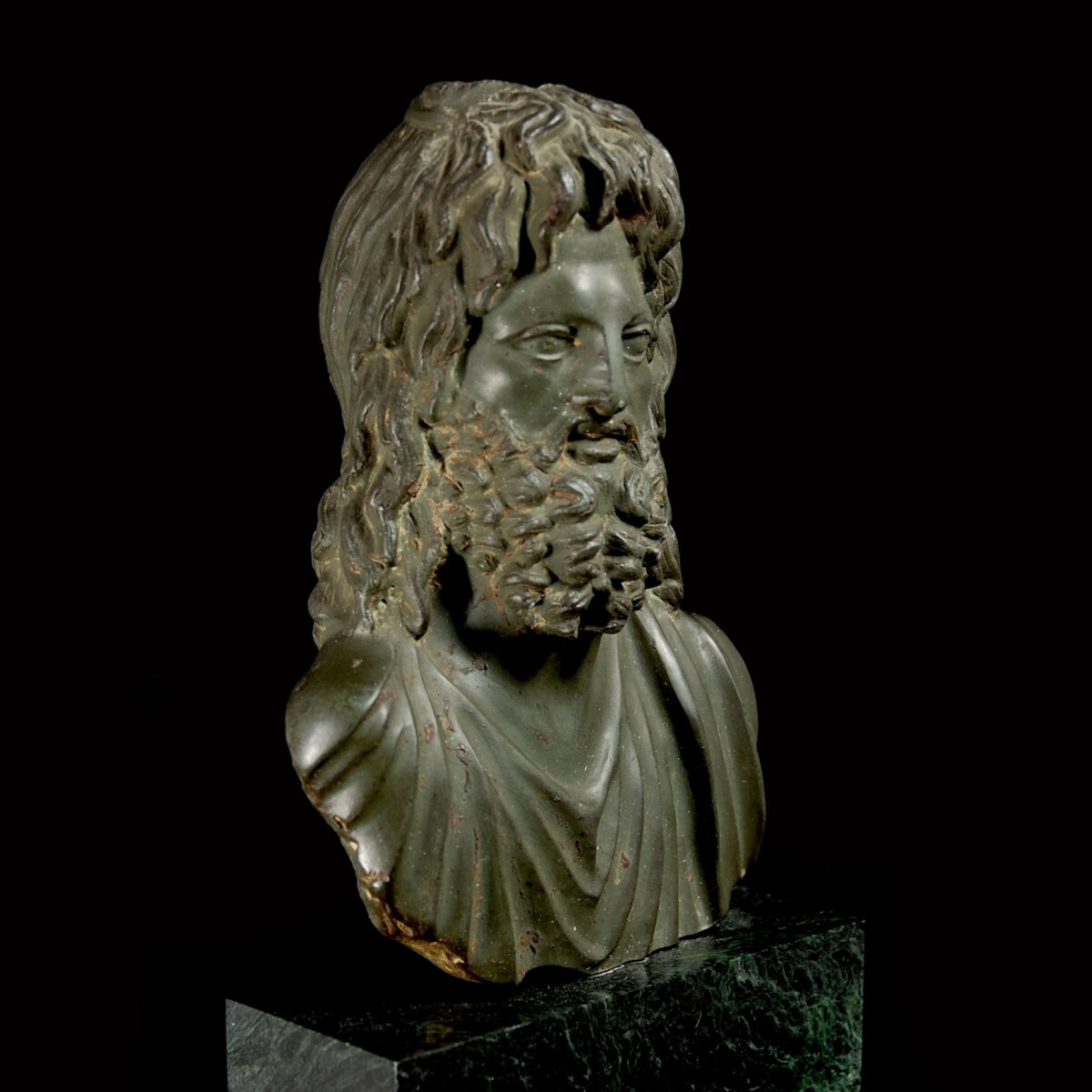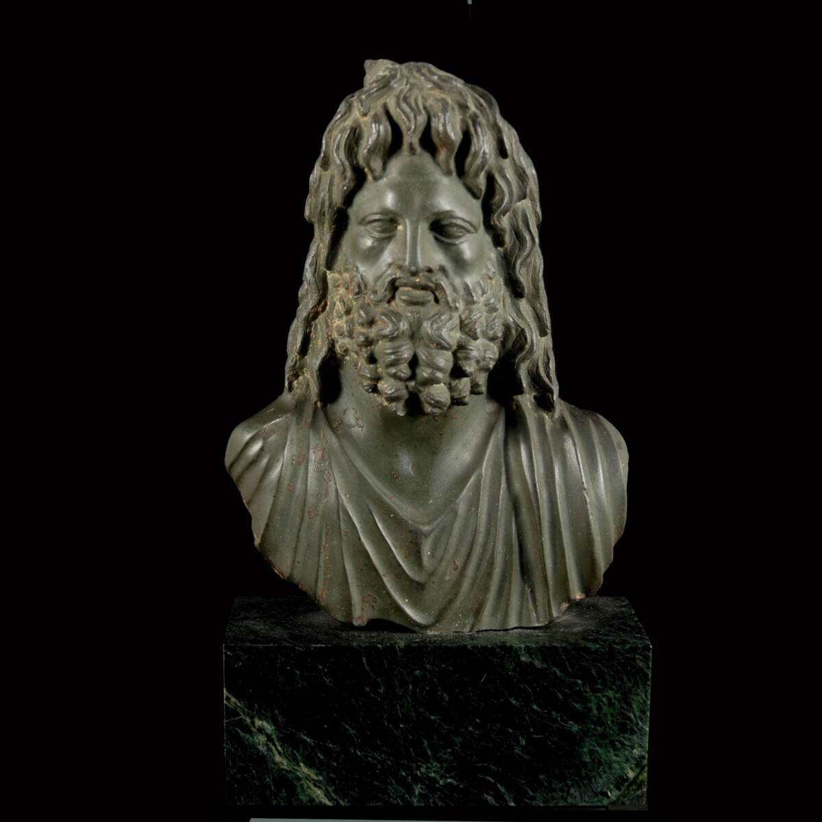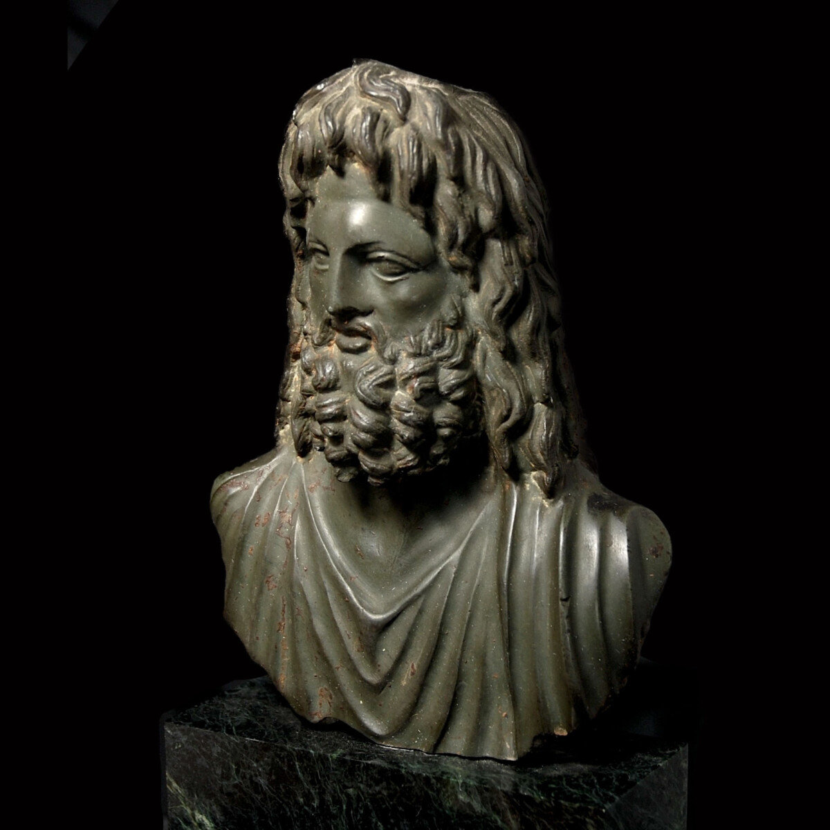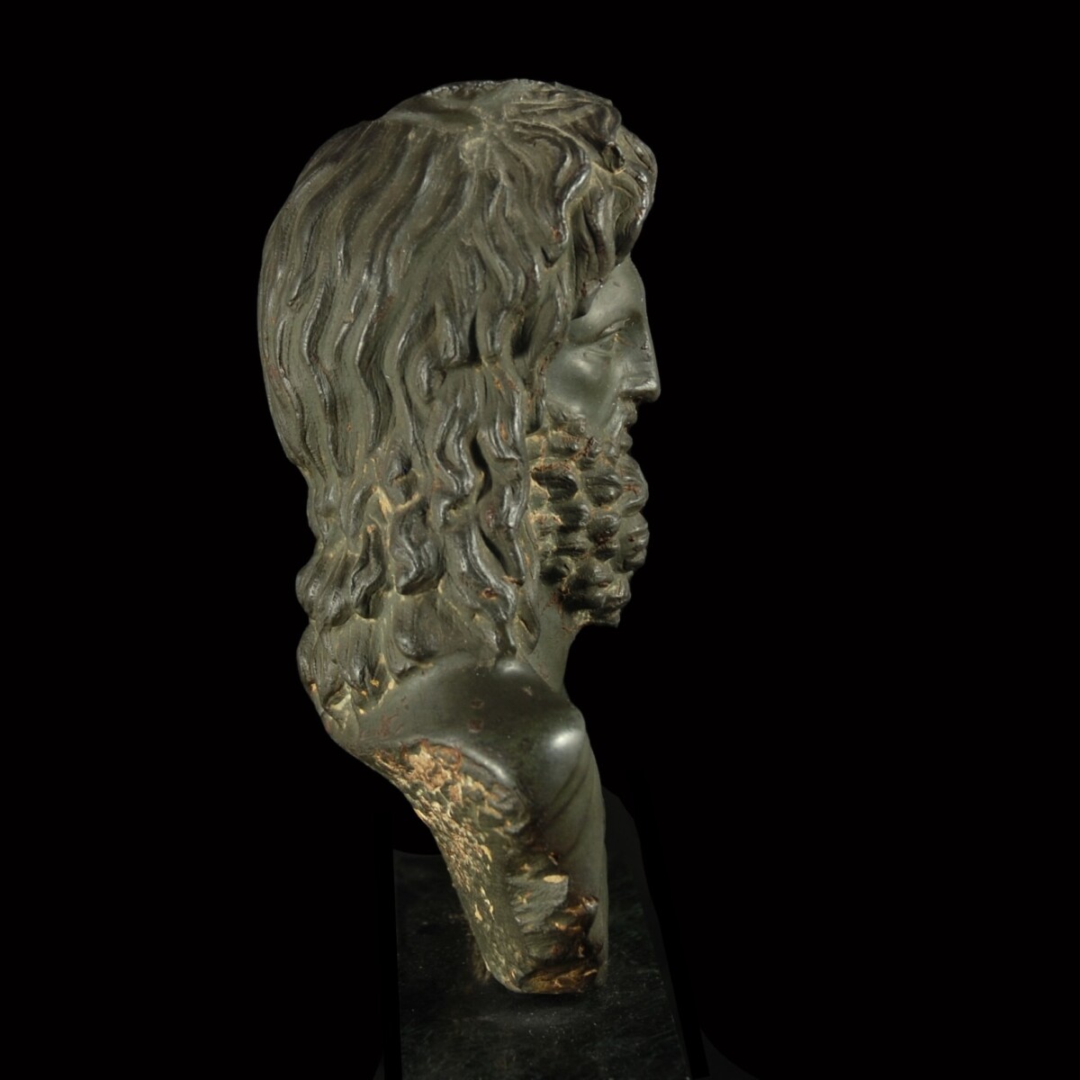 Description: Masterly worked out greywacke bust of Zeus Serapis based on the model that the Greek master Bryaxis created in the late 4th century B.C. for the Serapeum in Alexandria. The 12-meter-high original was destroyed in 391 A.D. by the Christians, preserved were high-quality copies dating to the Roman period, which were made of marble or alabaster throughout . Even more rare and more important is the present greywacke bust, which dates to the 1st century A.D. The head with a slender, angular face, which is framed by thick curls hanging into the forehead and over the temples. Below the nose a massive whisker, which merges into the curly beard. Well-known is the gaze from deeply sat eyes with finely drawn lids, which radiate gentleness and kindness and doubtlessly was copied by the Christians for the depiction of Jesus. Also, the slightly open mouth with the minimally hanging lower lip and the open space below has been established as symbol of gentleness in art history. The long hair cascades on the sides, covers the ears and falls far into the nape in the back. The kalathos, the harvest basket of Serapis, sits on the calotte, where today only parts are preserved. The bust itself is worked out in the Greek “curtain style”. It depicts a tunic and a himation thrown over it with a centrally protruding fold. The high quality of the greywacke underlines the importance of the syncretic God Serapis, who was introduced as an integrative Egyptian Greek empire god by Ptolemaios I and worshiped until far into the Roman period. On a stone base.