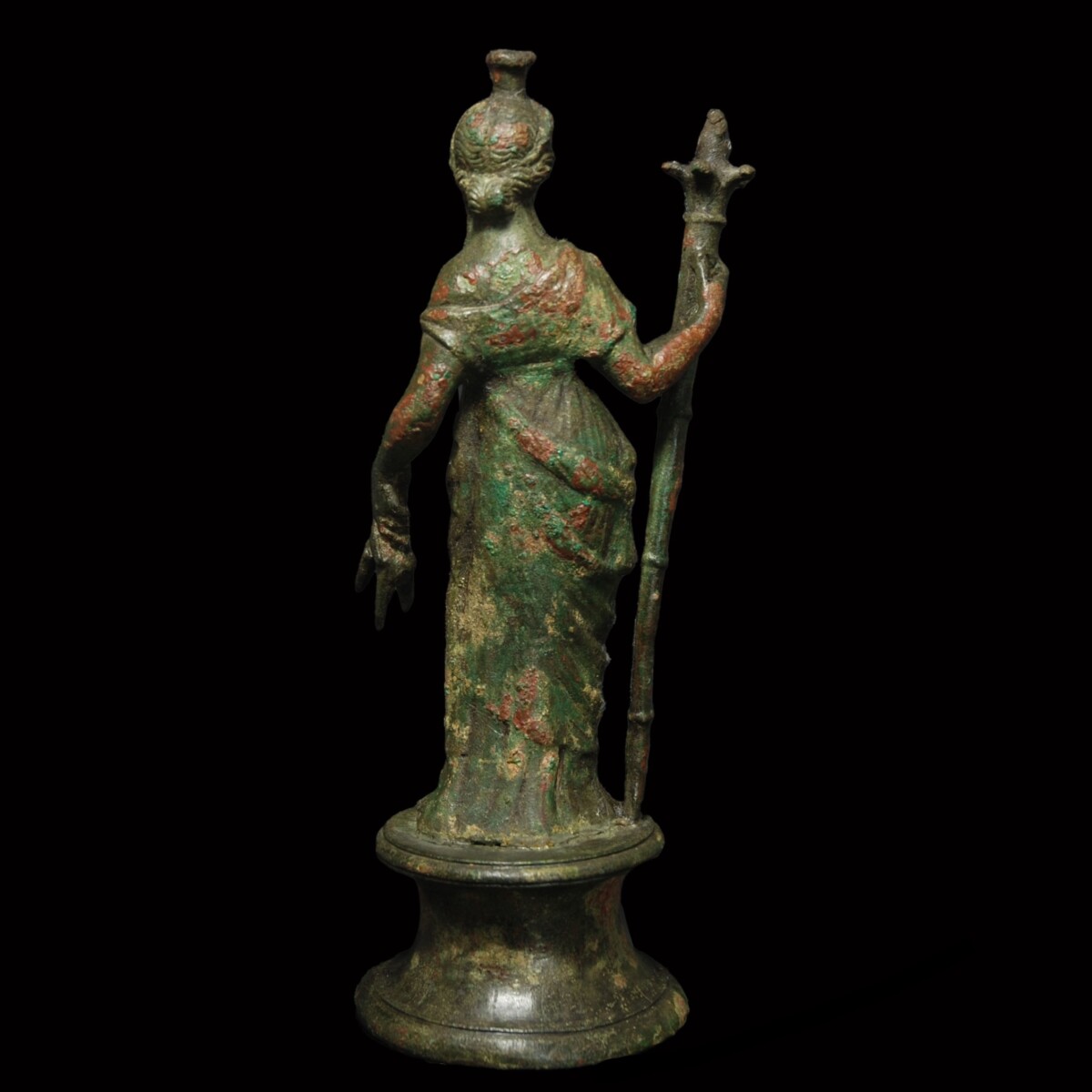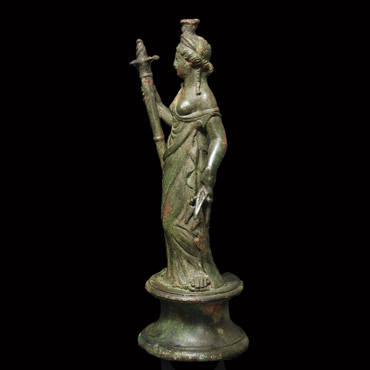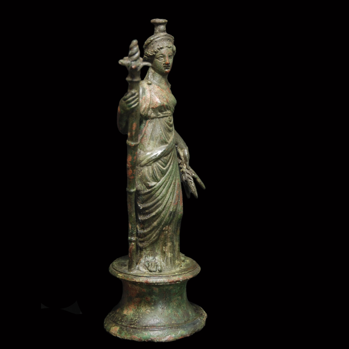 Description: Exceedingly charming and rare solid bronze statuette of the Roman goddess Ceres who was equated as the Greek Demeter since the 5th century B.C on the Italic peninsula. She stands in contrapposto on her original pedestal. In her right hand she holds a torch which reaches to the bottom. She helped during the search of her daughter Proserpina (Greek: Persephone), who was abducted into the underworld, but she also stands for the lighting on the right lifepath and is the symbol for the Eleusinian mystery cult. Her left arm hangs down, in the hand she holds a bundle of ears, which stands for agriculture and food. Ceres wears a long to the bottom reaching dress, which cascades over her left shoulder and uncovers the left breast. This underlines her nourishing role as a motherly goddess. Her face with very fine female features. The wavy hair is parted in the middle and is pulled together into a bun in her nape. Two braided strands cascade in the front over her shoulders. Ceres wears a diadem on her forehead, which holds a basked-shaped modius. This vessel for measuring of wheat symbolises also the abundance of the harvest and the food supply for the people. See for the type the bronze statuette in the Miho Museum in Koka, Japan, with the catalogue number Bac#037.