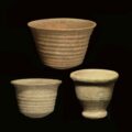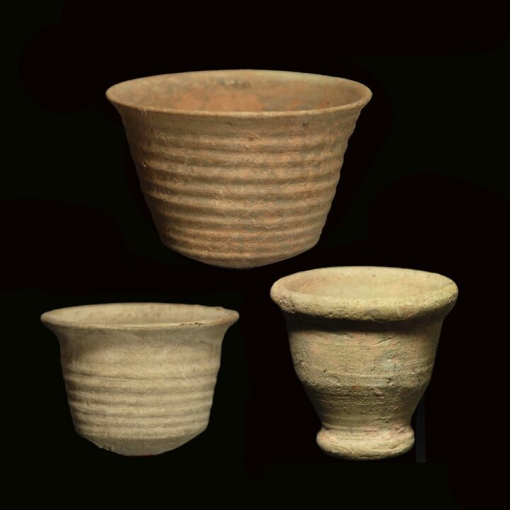 Description: Two horizontally ribbed Graeco-Roman terracotta cups with pulled out rims. The handleless drinking cups of different sizes were stacked inside each other to be stored. With their rounded bases they were placed upside down after use. In addition, a third cup of light clay with a biconical body, pulled outwards, thickened rim and set off foot ring. From Asia Minor.