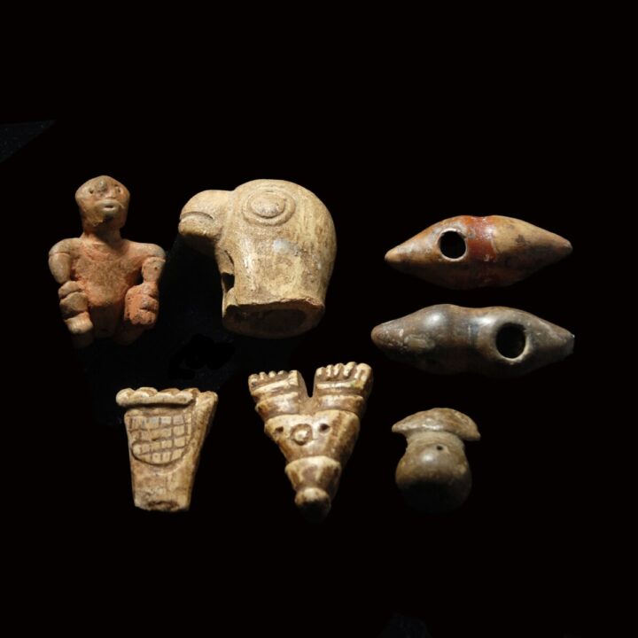 A Collection of Five Pre-Columbian Terracotta Whistles and Two Small Sculptures of Winged Insects