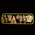 Description: A beautiful collection of five figurative terracotta whistles ("Pitos") of the Tairona culture. The small intruments are in form of a seated monkey, an amphibia on a ball, a head of a harpy, as well as shells. All are playable. Furthermore, in the collection are two interesting steatite miniature sculptures of the Tumaco-La-Tolita culture. They depict a winged insect, which stands for transformation and fertility with the form of its wings. See for this interpretation the coessential example in: Armand J. Labbé “Colombia Antes De Colón”, Bogota 1988, p. 20, no. 20.