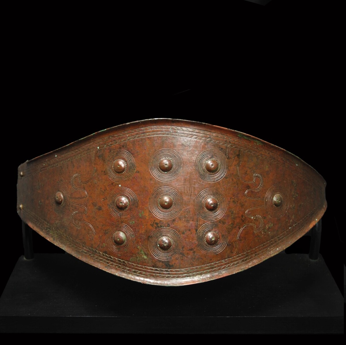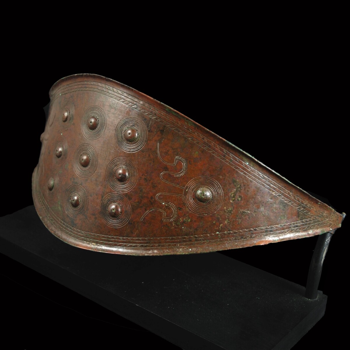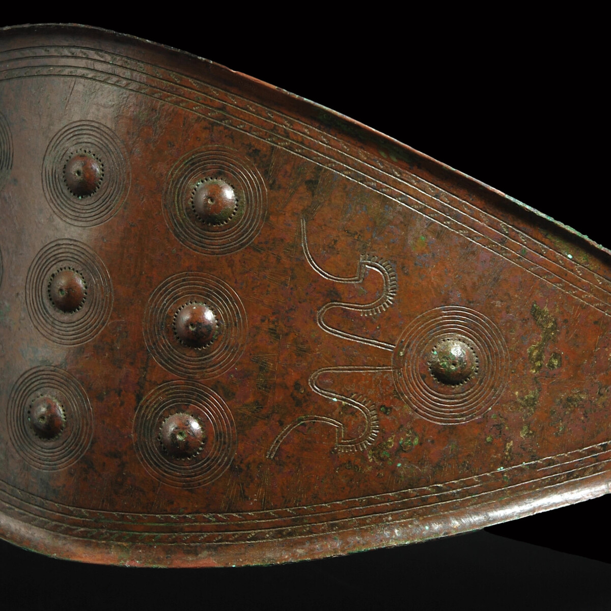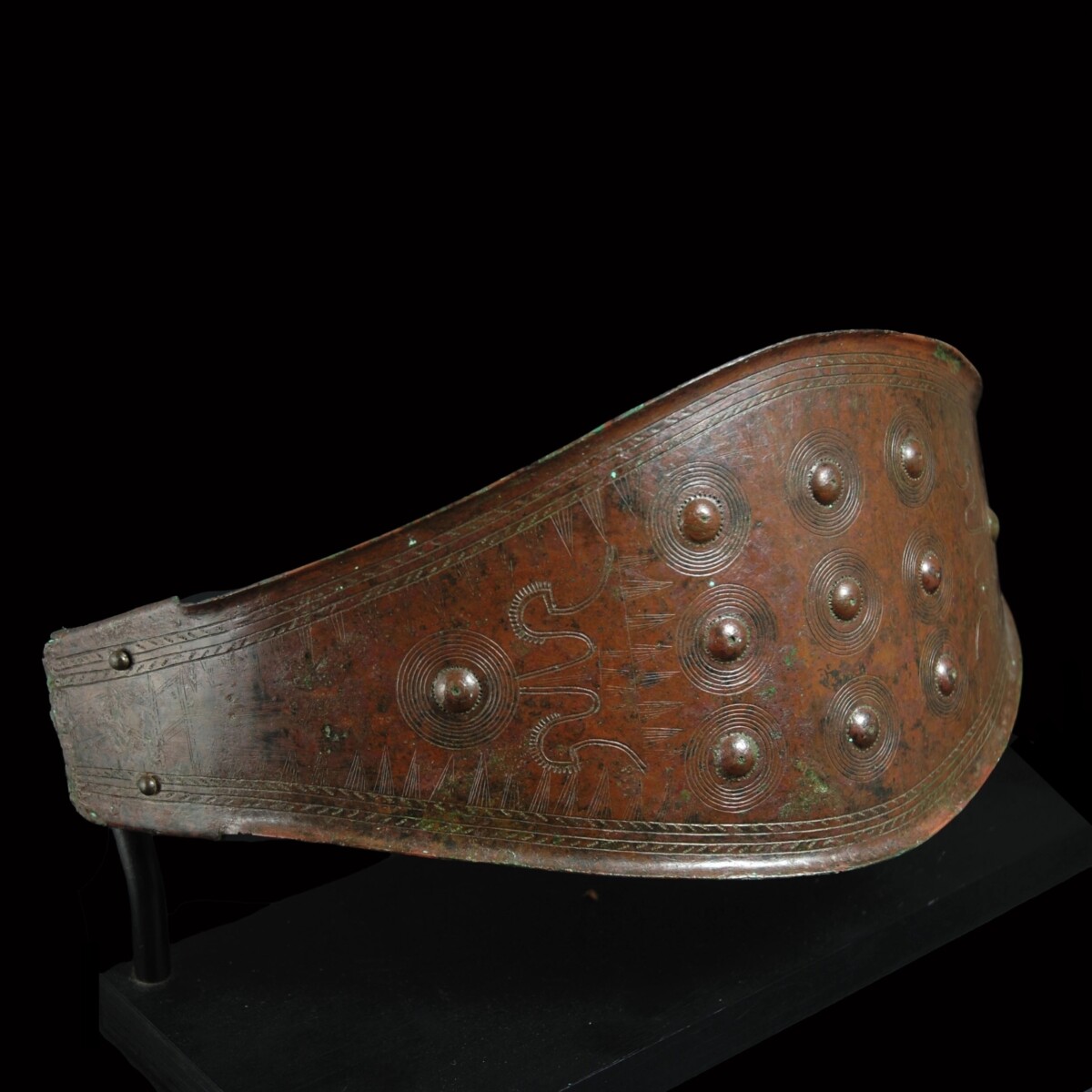 Description: Magnificently preserved and richly decorated bronze belt, which formed part of the costume of a woman of high status in southern Etruria or Picenum. The widest point at the center of the elliptical bronze sheet is decorated with nine raised bosses, each surrounded by dots and six concentric circles, thus forming a solar symbolism. On either side, there is an additional boss, likewise adorned with dot-and-circle decoration. From these bosses emerge stylized water birds extending toward the center, with long, upward-curving beaks, S-shaped bodies, and a horizontally mirrored head facing downwards. The edge of the belt is encircled by a herringbone pattern and continuous lines, from which very finely hatched triangles are oriented inward. The belt ends on one side in a hook and on the other in a rectangular plate; at these points, it was attached to a leather breastplate. Ceremonial belts of this type have been found in women’s graves. See for the type: Jacques Chamay "The Art of the Italic Peoples. From 3000–30 B.C.", Geneva 1993, pp. 136–137, no. 47. Our belt is published in: "Kunst der Antike. Ancient Art", Katalog 27 der Galerie Puhze, Freiburg 2013, p. 19, no. 28.