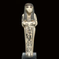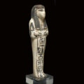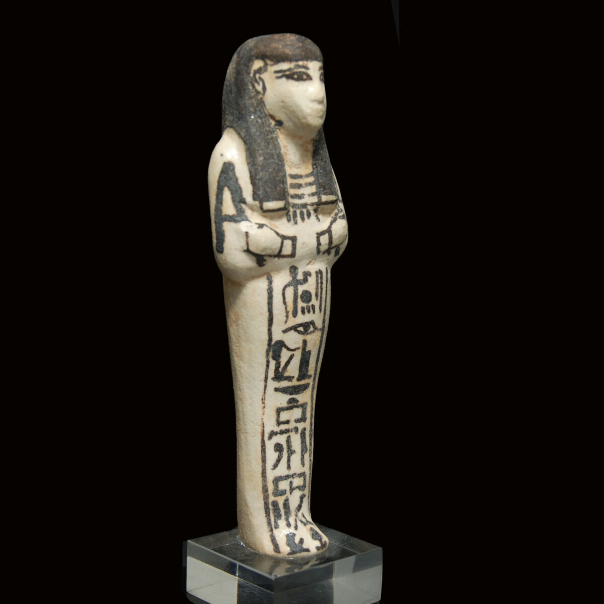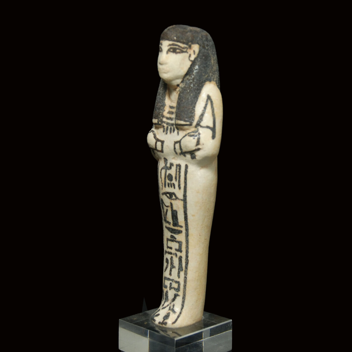 Description: Very elegant ushabti from the New Kingdom, naming its owner as “the Lady of the House Inhay.” This title was a common designation for married women of high status. The ushabti is in the typical mummiform shape, with the arms crossed over the chest and rendered in relief. In both hands she holds hoes for agricultural work. She wears a long, black-painted tripartite wig, with two locks falling over the shoulders. A multi-row neck collar is painted between the locks. Across the back hangs a net-like bag for seed grain. The face is finely modeled, with nose and lips standing out in relief. The eyes, the long eyeliner and the curved eyebrows are also applied in black. The vertical hieroglyphic inscription begins beneath the arms and extends down to the protruding feet. The translation of the finely drawn characters reads: “The Enlightened One, Osiris, Lady of the House Inhay.“ Mounted.