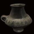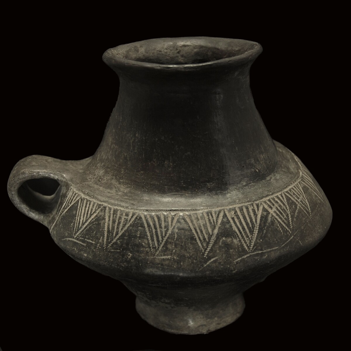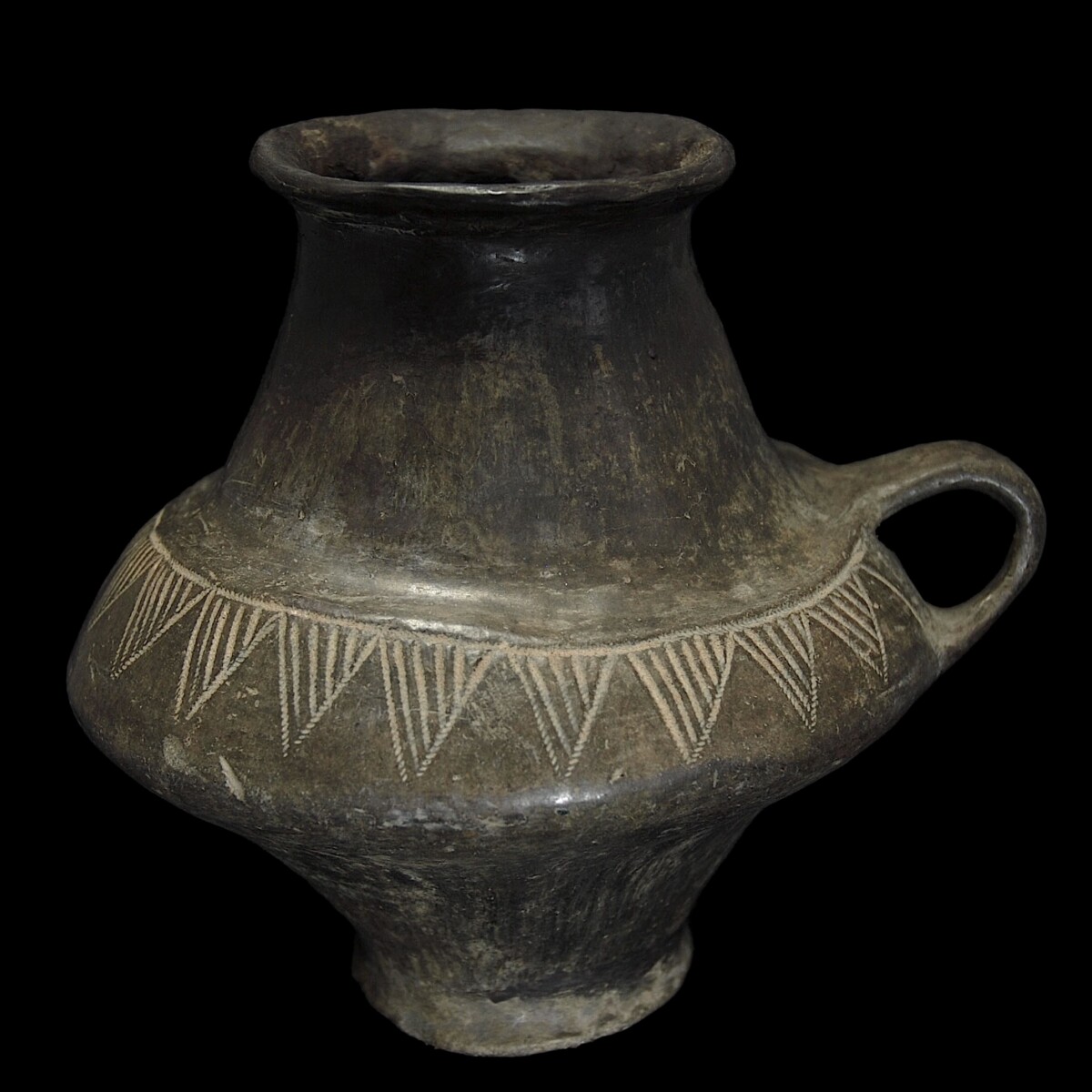 Description: Large biconical jug, formed by hand of the so-called Impasto Ware, which was fired from polished, dark grey clay. The vessel stands on a set off, at the bottom flat foot ring. The body widens hoop-shaped towards the middle, before it sharply tapers towards the neck. Engraved in the clay are encircling hatched triangles in the top part towards the shoulder. The engraved rows are interrupted by a circular band handle in the back. The neck is long and conical, the rim is pulled outwards and rounded. A quite rare form.