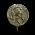 Description: Large round bronze disc with a relief carved using fine repoussé work, depicting the animal tamer ("Master of Animals") typical in northwest Iranian iconography. The deified human figure with beard and large eyes strides to the left and holds in each hand a springbok on its backside. The animals with bent heads and stretched out legs. Above the scene a bird of prey lying on its back. The relief is framed by an encircling rib. Around the rim a stamped chain decoration. The disk has on the back a tapering extension, where the pin was affixed. See for the type Éric de Waele “Bronzes du Louristan et d’Amlash. Ancienne Collection Godard”, Louvain-La-Neuve 1982, p. 148-149, fig. 123. Mounted.