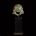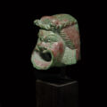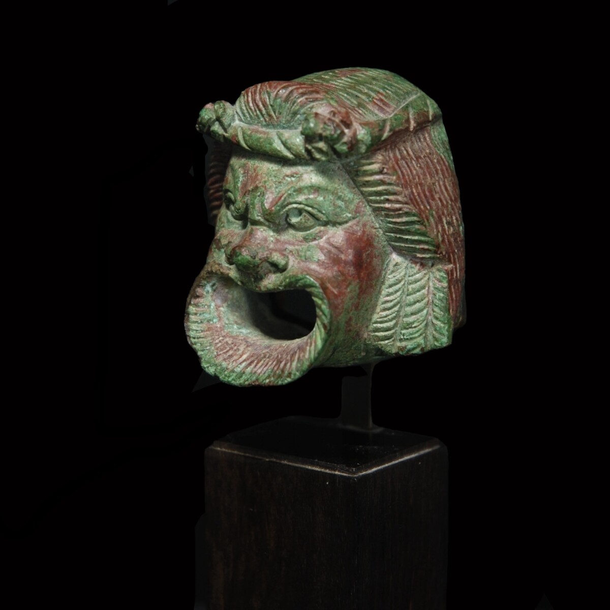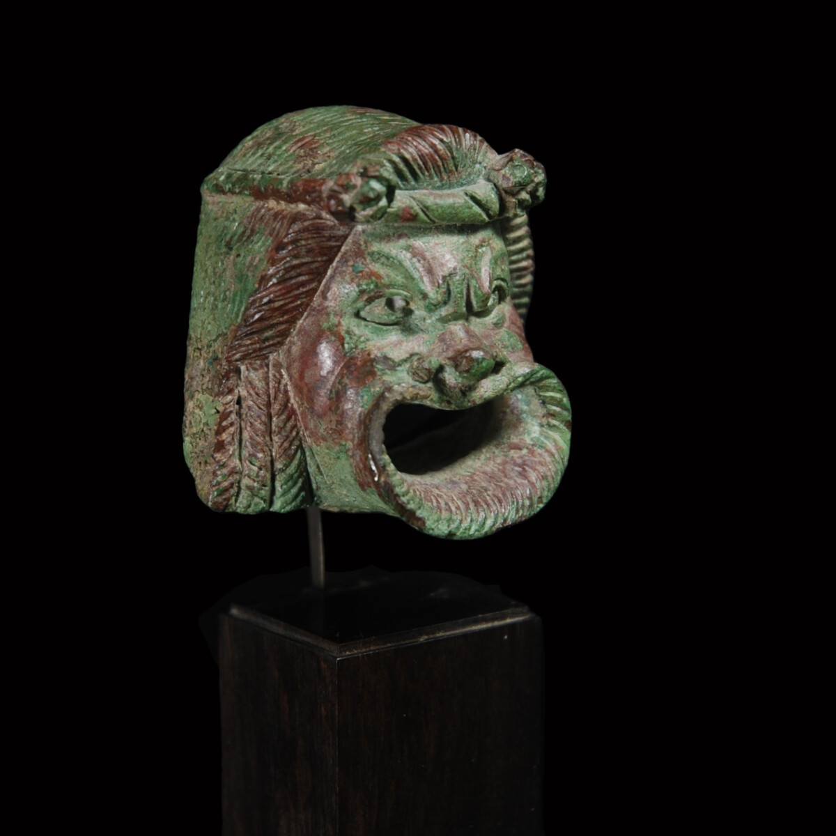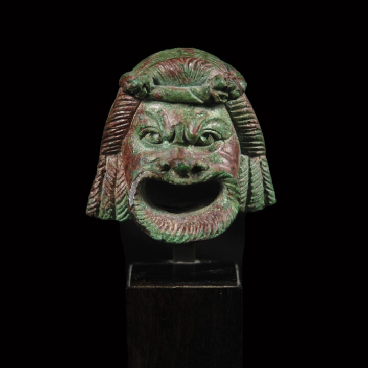 Description: Very expressive and in detail worked out, solid bronze theatre mask with grotesque features of a comedian. The deeply pierced eyes were once with inlays. The hair, which cascades in corkscrew curls, is held together with a floral filet. The type of the mask, with rolled back hair, flared nostrils and a grimaceous mouth wide open with a moustache over a shovel-shaped beard, was characteristic for the role of the leading slave in the New Comedy. The slave and his trickery were a popular theatre role for the Romans. A typical reversal of the social hierarchy, which happened on stage between the slave and his master, occurred when love or lust took the master’s mind and money away and forced him to ask for help from his resourceful slave. Their dramatic performances could be vulgar and offensive, yet they remained extremely popular with ordinary citizens. The present piece, probably once a decorative element of a furniture or a jug, reflects the popularity and importance of theatres for the Romans also in daily live. See for the type Christie’s auction London on 16 December 2020, lot 46. A thymiaterion in the form of a comedian see object number 87.AC.143.1 in the J. Paul-Getty-Museum, Malibu, USA. Mounted.
