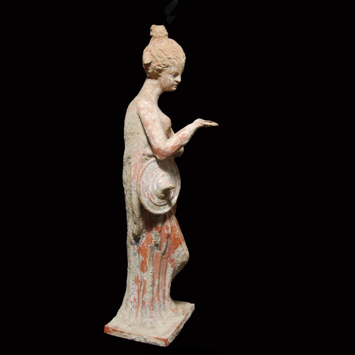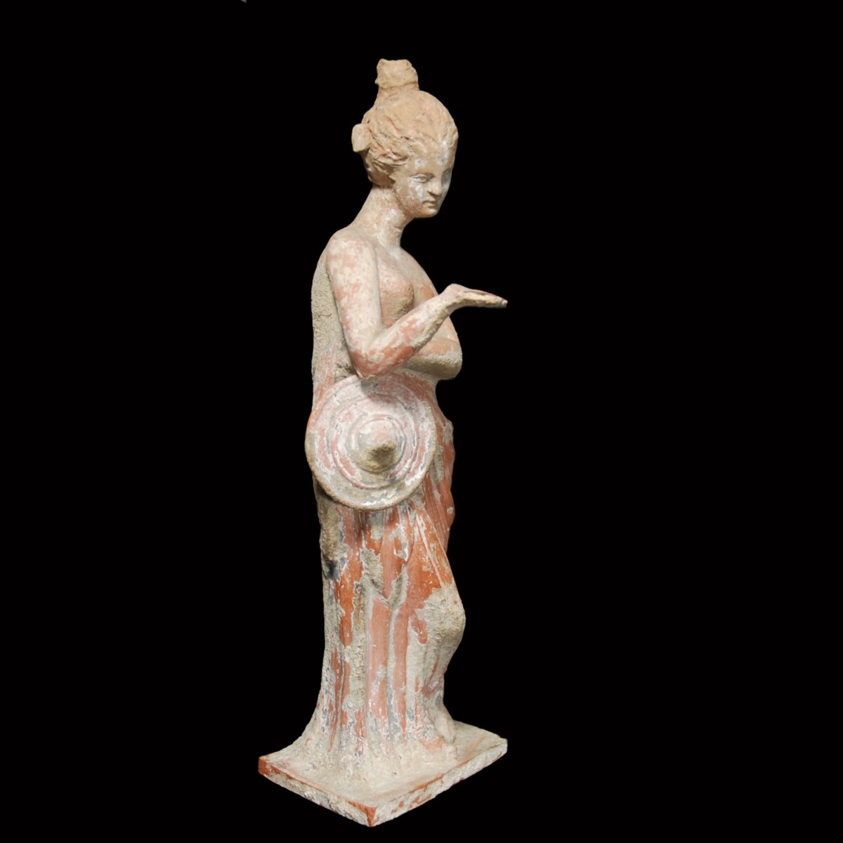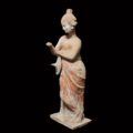 Description: An exceptionally graceful terracotta statuette of a woman standing in contrapposto, made of reddish clay. She has crossed her right leg in front of her left supporting leg and gazes absently into her palm, which she holds out in front of her. There she once held a mirror, today lost. The left arm is placed in front of her chest. The hand holds the himation, which is wrapped around her hip and cascades in folds to the bottom, and a “tholia”, a sunhat with a pointy crown and broad round brim. Her head sits atop a long neck with a Venus fold. The face is following the beauty ideal with delicate features and a small mouth formed to a gentle smile. The cheeks are round, the nose straight and the gaze full of grace. The wavy hair is parted in the middle and bound together to a bun on top. Blossoms and leaves adorn the hairstyle. The statuette stands on its original plinth and has in the back the typical venting hole. From Boeotia. Accompanied by a TL test confirming the age of the figurine.