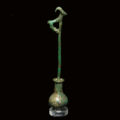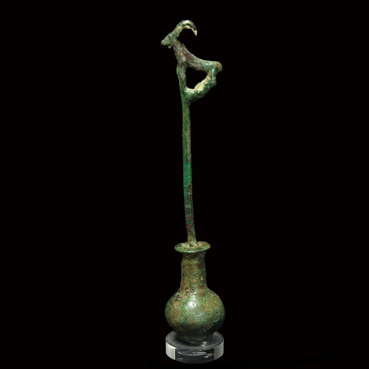 Description: Bronze cosmetic vessel (kohl container) with a belonging makeup pin with an ibex as the finale. The animal naturalistically formed, with long, backwards curved horns, a thin body with a protruding small tail. The legs are structured and connect on the hooves. The rod is cylindrical and today sticks in the vessel due to corrosion. The small bottle itself on a flatter, set off base with a bulbous body and long, cylindrical neck. The rim is horizontally protruding. Mounted.