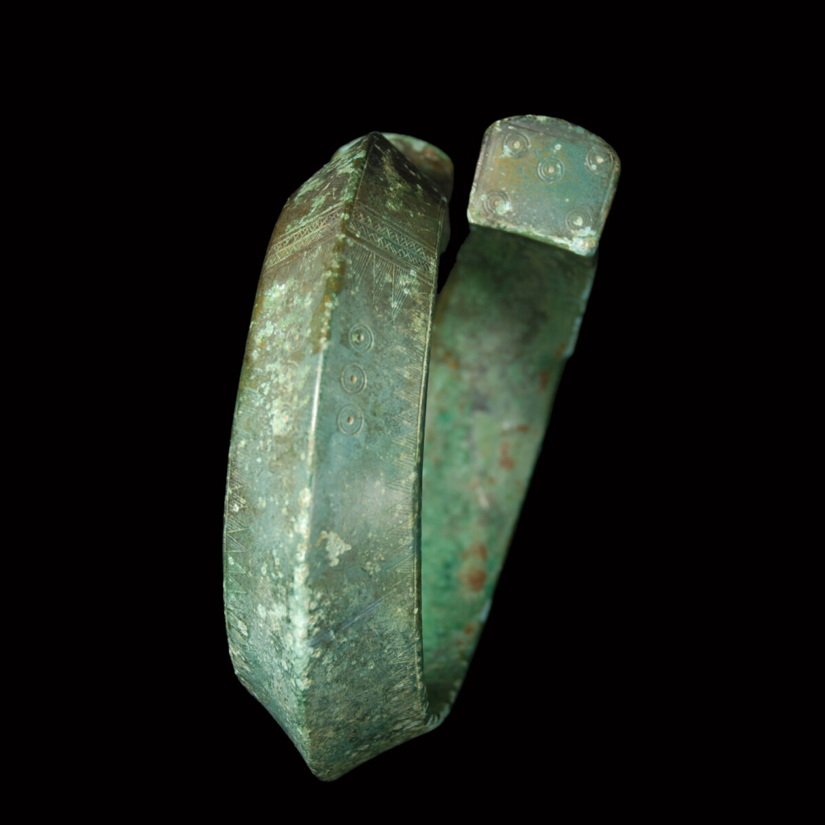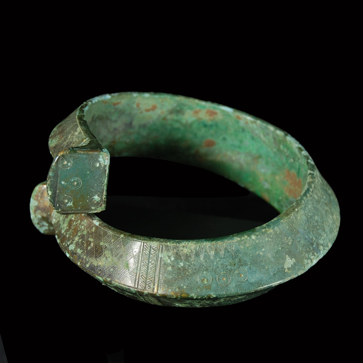 Description: Heavy, solidly worked out bronze armlet dating to the Macedonian Iron Age. The flat ends with tapering edges are overlapping. The richly decorated outer surface has an angular central ridge, while the inner surface of the rim is smooth and slightly concave. The incised and dotted decoration shows five diced eyes on the flat ends. The outside is decorated with hatched lozenges, bands and triangles, as well as punched circles. The armlet belongs to the so-called Macedonian bronzes, which were found particularly in tombs of women of the upper class from the northwestern Aegean to the central Balkans. They depict strong influences from the Hallstatt culture of Central Europe. See for the type the armlets of tomb 111 in Milci-Gevgelija in southeastern North Macedonia, which the deceased still held on her arm. Another example is today in the Metropolitan Museum of Art with the object number 1998.25.