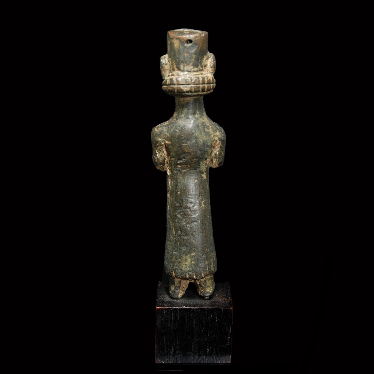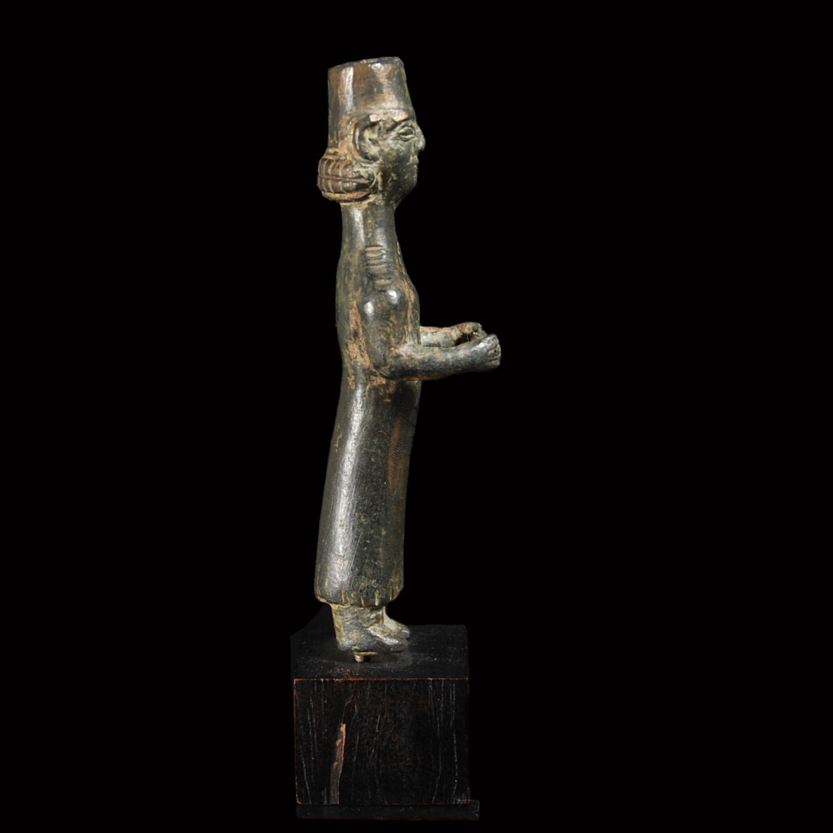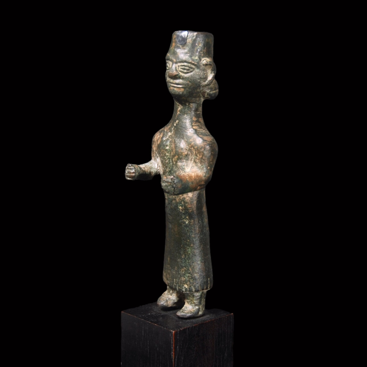 Description: Solid bronze statuette of a priestess from the Urartian Kingdom, which rose to great power in the 9th century B.C. in Asia Minor, before it declined after around 300 years and was conquered by the Medes. The woman wears a long gown reaching to the bottom, which slightly swings outwards and ends with fringes. Her small round breasts are clearly accentuated. She wears a cylindrical-shaped polos on the head, where a crown of a different material (ivory?) was inserted. The ornamental object was attached to the polos in the front through a still-preserved pin and rivet, and at the rear through a hole. The head of the priestess sits oversized but sublimely on the long neck. She looks out with almond-shaped eyes between thick lids straight ahead, her broad mouth is formed to a gentle smile. The face is round, the nose broad. The big ears protrude on the sides, pushing back the rows of curls, which look out from the polos. In the nape the hairstyle forms two thick rows of curls. The woman has her arms along the slender upper body stretched out and bent. The hands are in holding position and once held separately worked out and today missing offerings. See for the posture of the statuette in the British Museum with the registration number 1874,1003.1. As well as another woman statuette in: Gisela Zahlhaas “Orient und Okzident. Kulturelle Wurzeln Alteuropas 7000 bis 15 v. Chr. ”, Munich 1995, fig. I. Mounted.