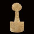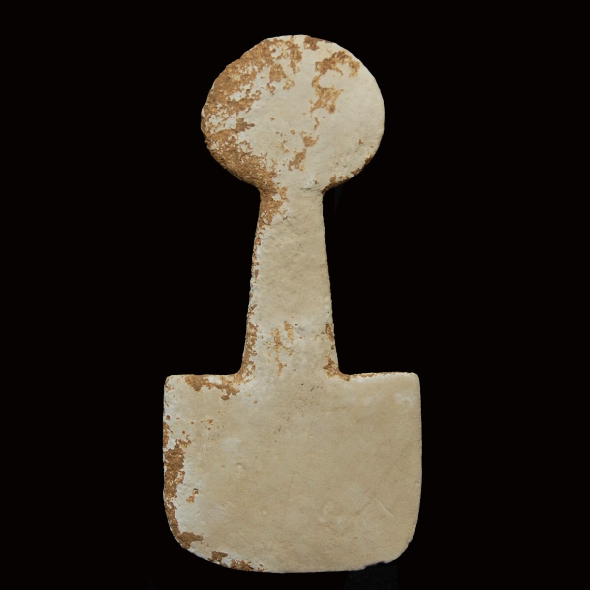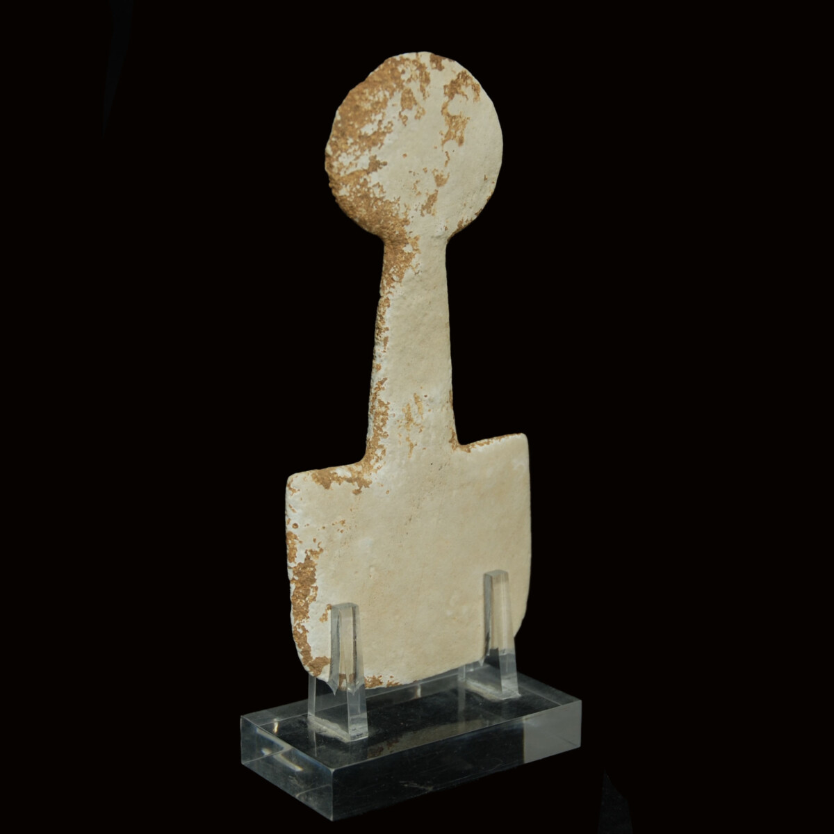 Beschreibung: Großes anatolisches Marmor-Idol des sogenannten Kusura-Typs. Die aufgrund ihrer Form auch Violin-Idole genannten Fruchtbarkeits-Statuetten stammen von der Westküste Kleinasiens und sind weit bis ins Hinterland bezeugt. Sie sind Zeitgenossen der berühmten Kykladen-Idole. Dieses Exemplar gehört zur frühbronzezeitlichen Form ohne Arme und Haarlocken. Vom kreisrunden Kopf aus verbreitert sich der kräftige, gerade Hals nach unten und geht horizontal direkt in den trapezförmigen, unten in feiner Harmonie abgerundeten Körper über. Das qualitätsvolle Idol ist außerordentlich dünn gearbeitet, die Oberflächen sind leicht gewölbt, die Kanten zugeschliffen. Geradezu lichtdurchscheinend hatte es im Fruchtbarkeitsritus wohl besondere Bedeutung. Vergleiche zum Typus „Kunst und Kultur der Kykladen“, Ausstellungskatalog des badischen Landesmuseums Karlsruhe, 1976, Nr. 487, abgebildet auf S. 378, beschrieben auf S. 548. Gesockelt.
