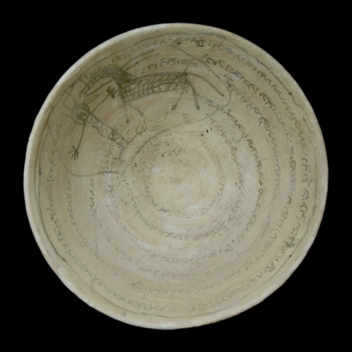 Beschreibung: Tiefe, halbkugelförmige Schale auf rundem Standring aus hellem Ton, die zu den mesopotamischen Beschwörungs- oder Zauberschalen zählt. Diese erfreuten sich vor allem im 6. und 7. Jahrhundert n. Chr. großer Beliebtheit, um Dämonen aus dem eigenen Haushalt zu vertreiben oder davon fernzuhalten. Die Schale ist auf der Innenseite mit schwarzer Tinte bemalt und beschrieben. Sie zeigt die Dämonin Lilith mit aufgestellten Haaren und weit zur Seite gestreckten Armen mit krallenförmigen Händen, die für ihre Hilflosigkeit stehen. Sie ist bewegungsunfähig, starrt den Betrachter an und ist im sie umgebenden Text gefangen. Das wild aufzäumende Pferd an ihrer rechten Seite ist das Zeichen für die Vertreibung, mit dem die Dämonin möglichst schnell das Haus verlassen soll. Der Text setzt unter dem Rand an und läuft spiralförmig in sechs Zeilen zur Schalenmitte. Es handelt sich um eine sogenannte „Pseudoinschrift“, die das Aramäische imitiert, aber keinen Sinn ergibt. Es ging den wohl analphabetischen Besitzern auch weniger um lesbaren Inhalt, als vielmehr darum, Dämonen durch den spiralförmigen Verlauf des Textes schwindelig zu machen und im Schaleninneren zu fangen. Aus diesem Grund wurden diese Schalen verkehrt herum in Hauseingängen vergraben, um den bösen Geistern keine Möglichkeit zu geben zu entweichen. Der Scheintext hatte aber noch einen weiteren Vorteil: Die Schale konnte so an Gläubige sämtlicher Religionsgruppen, ob Juden, Christen, Manichäer, Mandäer oder Anhänger altbabylonischer Glaubenrichtungen, die allesamt zu dieser Zeit in Mesopotamien lebten, verkauft werden. Vergleiche zum Typus mit Pseudo-Inschrift die Schalen im Metropolitan Museum of Art mit der Objektnummer 86.11.260 sowie im British Museum mit den Museums-Nummern 91747 und 103363.