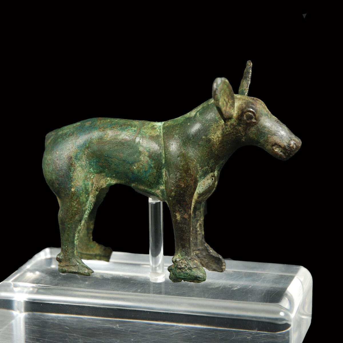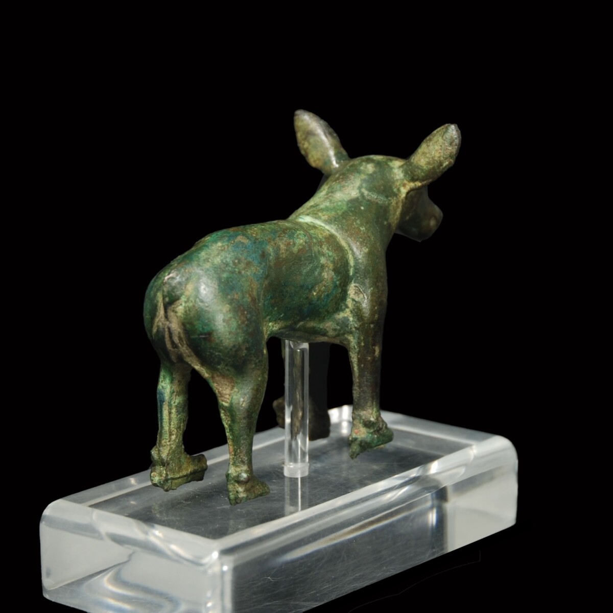 Beschreibung: Fein gearbeitete, schwere Bronze-Statuette eines Hirschkalbs oder jungen Elches, die aus dem Kulturkreis der skythischen Steppenvölker stammt. Das Tier weist auf dem Bauch einen Schlitz auf und war mit den Beinen an einem Objekt, wohl einem Kessel festgelötet, wo es als zoomorpher Griff diente. Das Tier ist in wachsamer Haltung dargestellt. Die runden Augen sind weit geöffnet, die Nasenlöcher am Ende der langen Schnauze aufgebläht. Der Kopf ist angehoben, die übergroßen Ohren sind aufgestellt. Diese Art der Stilisierung ist bei skythischen Tierdarstellungen typisch und soll die erhöhte Wachsamkeit unterstreichen. Der massige Körper ist dagegen naturalistisch gestaltet. Die Muskulatur an Schulter und Schenkel sowie die Proportionen des Rückens und der Beine sind fein ausgearbeitet. Hinten am runden Gesäß steht ein kleines Schwänzchen ab. Vergleiche einen ähnlichen zoomorphen Henkel (allerdings aus Gold) von einem Kessel aus dem „Kurgan“ (Grabhügel) in Chochlatsch, der heute in der Eremitage St. Petersburg mit der Inventarnummer 2213/13 aufbewahrt wird. Publiziert in: Wilfried Seipel (Hrsg.) „Gold der Steppe. Sensationsfunde aus Fürstengräbern der Skythen und Sarmaten“, Leoben 2007, S. 236, Nr. 90. Vergleiche zur Darstellung von Gesicht und Ohren auch den Stangenaufsatz in derselben Publikation S. 128, Nr. 12. Auf Acrylsockel.