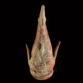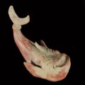 Beschreibung: Seltene und außerordentlich naturalistisch gearbeitete Terrakotta-Votivstatue eines Seeteufels. Die Figur aus sandfarbenem Ton mit rotem Überzug zeigt den Fisch in seiner typischen Lauerhaltung mit aufgestellter, sichelförmiger Schwanzflosse. Das Maul ist geöffnet und bereit zuzuschnappen, die dichte Zahnreihe sichtbar. Der Kopf mit den großen Augen und den charakteristischen Falten darüber ist gekonnt akzentuiert. Die beiden spitz zulaufenden Seitenflossen sind seitlich ausgestellt. Oben steht zapfenartig die Rückenflosse ab. Der Boden ist flach. Seeteufel waren vor allem bei der Bemalung der bekannten süditalischen Fischteller beliebtes Motiv. Vergleiche dazu etwa Norbert Kunisch „Griechische Fischteller. Natur und Bild“, Berlin 1989, Tafel III, S. 143. Als Votiv-Statuetten sind sie ungleich seltener. Wohl aus Kampanien.